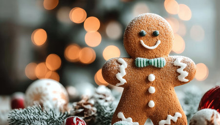 Festive Gingerbread Man with Christmas Tree Lights and Holiday Treats Creating a Cozy Atmosphere