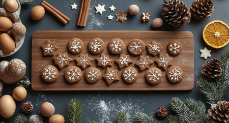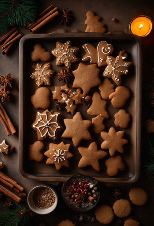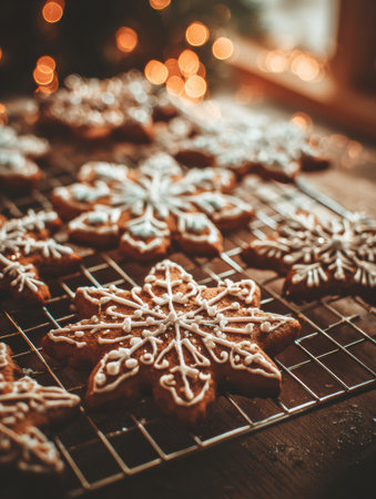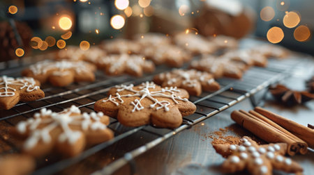 holiday baking, freshly baked gingerbread cookies cooling on a wire rack, with cinnamon sticks and star anise on the countertop emitting festive scents