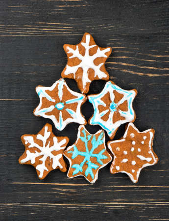 Homemade Christmas gingerbread cookies snowflakes in the form of fir on wooden background