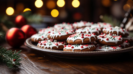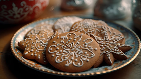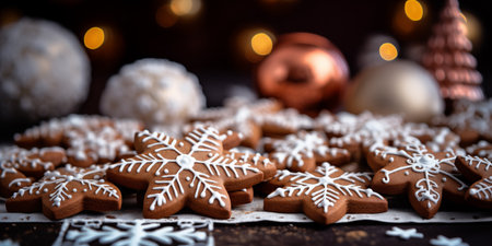 Festive gingerbread cookie with snowflakes on a decorated tray during the winter holiday season