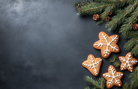 Christmas gingerbread cookies on a dark background. Flat lay, top view.