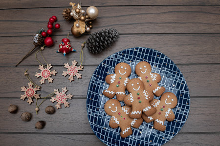 Christmas gingerbread cookies in a plate on a wooden table with Christmas decorations