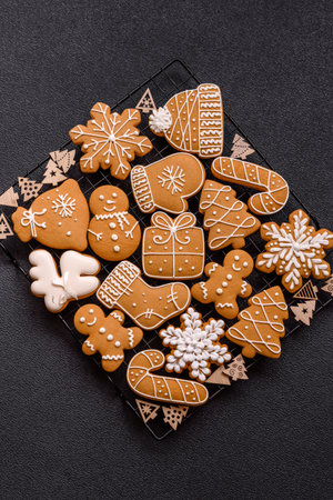 Beautiful delicious sweet winter Christmas gingerbread cookies on a gray textured background. Preparing for a family holiday