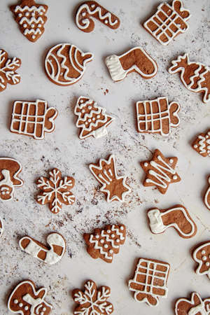 Composition of delicious gingerbread cookies shaped in various Christmas symbols. Placed on white rusty table. Top view.
