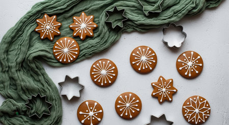Overhead shot of gingerbread cookies decorated with white icing, arranged with cookie cutters and a green scarf on a light surface.