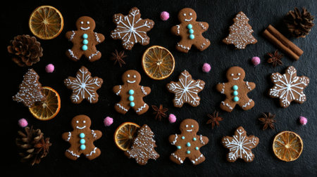 A delightful flat lay of gingerbread cookies in various festive shapes, dried orange slices, pinecones, and cinnamon sticks on a dark background.
