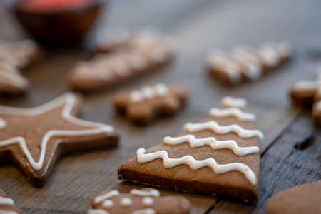 Traditional Christmas cookies. Homemade sweet decorated gingerbread biscuits with icing