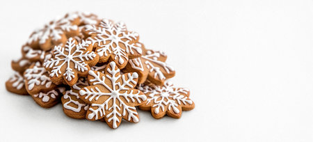 Pile of snowflake-shaped gingerbread cookies with icing. High quality photo