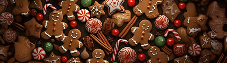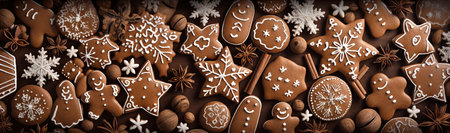 Abstract background with Christmas gingerbread pieces and cookies on brown background. Horizontal composition.