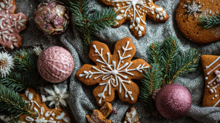 A delightful arrangement of gingerbread cookies shaped like snowflakes, surrounded by festive decorations and pine sprigs, perfect for holiday treats.