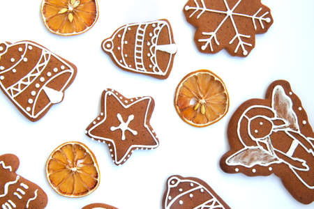 Tasty homemade Christmas gingerbread cookie of various shapes with sugar glaze and slices of dried lemon on white background