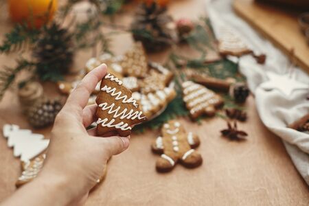 Gingerbread tree cookie in hand on background of anise, cinnamon, pine cones, cedar branches on rustic table. Merry Christmas. Atmospheric image. Baked christmas cookie