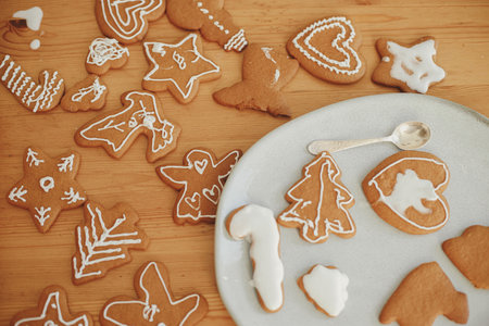 Christmas gingerbread cookies with icing on modern plate and wooden table, flat lay. Simple authentic decorated baked christmas cookies with sugar frosting by child. Xmas holiday preparation