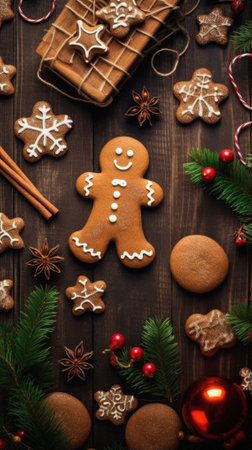 A delightful arrangement of gingerbread cookies features cheerful designs. Surrounded by lush evergreen branches and red ornaments, this festive scene evokes warm holiday feelings.