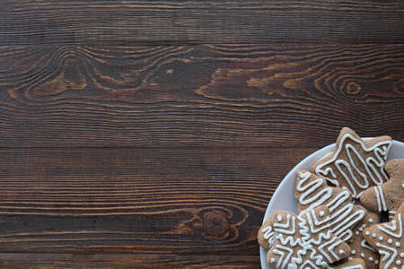 Christmas background with gingerbread cookies on a plate and wooden brown texture