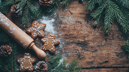 A rustic flat lay featuring Christmas gingerbread cookies, flour, and a rolling pin surrounded by pine branches and holiday decor.