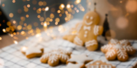 Abstract blurred background with gingerbread cookies on a table with Christmas lights