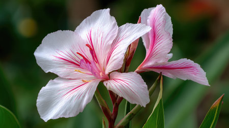 Close-up image of a flower with delicate white petals and vibrant pink stripes. The flower is in sharp focus, while the background is out of focus, drawing attention to the flower's intricate details. The image captures the beauty and vibrancy of a flower in nature.