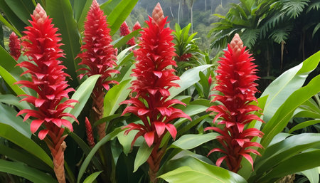 Striking red ginger flower alpinia purpurata with white florets and red bracts, surrounded by lush green leaves covered in fresh water droplets.