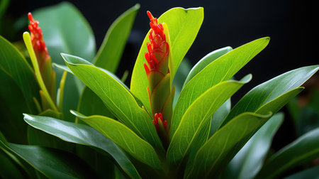 Bright red tropical blooms emerge from green foliage showcasing natural beauty in a captivating arrangement against a dark background.
