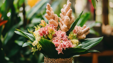 A stunning floral arrangement featuring ginger roots and vibrant orchids, perfect for enhancing any indoor space with a touch of tropical elegance.