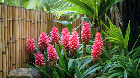 Pink and red ginger flowers blooming beside a bamboo fence in a lush green garden.