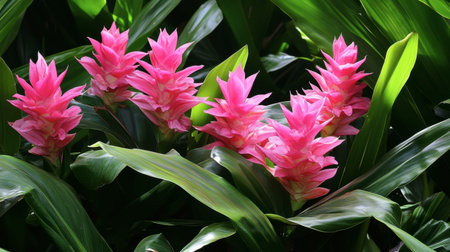 Vibrant pink ginger flowers in bloom, contrasting beautifully with the dark green foliage.