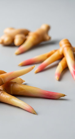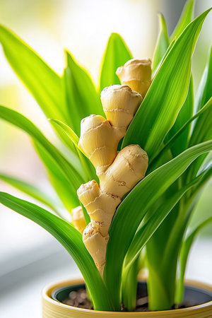 Close-up of a ginger plant sprouting vibrant green shoots, symbolizing growth and vitality. Captured in natural daylight, showcasing a realistic botanical composition.