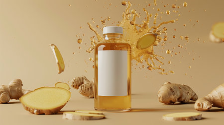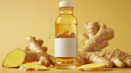 The transparent beverage bottle with ginger around the it, slice of ginger levitating around the bottle ground. Generated by artificial intelligence.