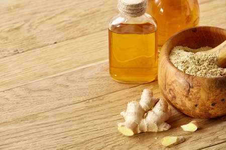 Bottles with ginger essential oil on wooden background