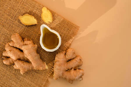 Sauce bowl of cooking ginger oil, ginger root on beige background. Healthy food eating concept. Zingiber officinale Natural cosmetics ingredients for skincare, body and hair care Alternative lifestyle
