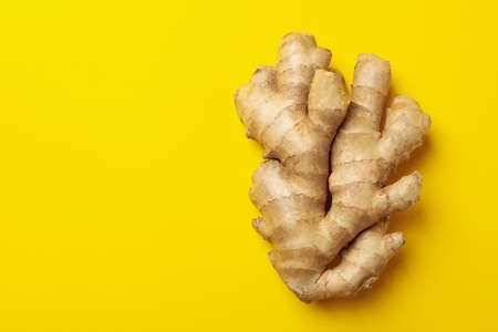 Fresh raw ginger on yellow background, space for text