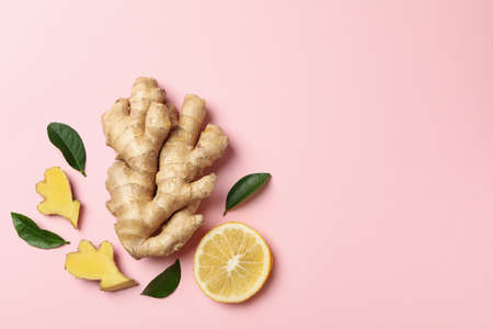 Fresh ginger, leaves and lemon on pink background