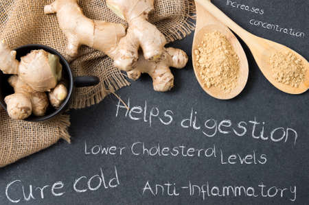 Composition of ginger on a stone countertop and inscriptions mentioning its advantages