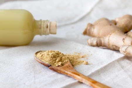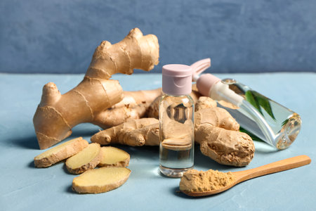 Bottles of ginger cosmetic oil and wooden spoon with dried powder on blue background