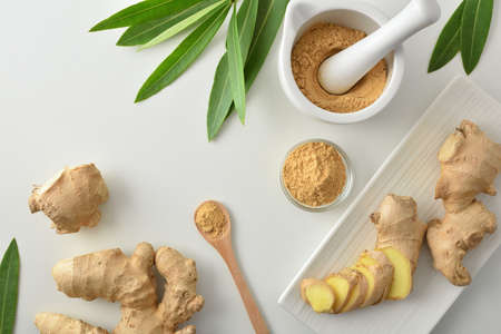 Heaps of ginger powder and roots on light background