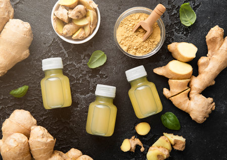 Bottles of immune ginger energy shot drink with ginger root and grounded powder on black background.