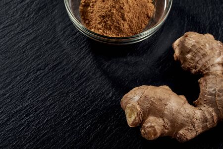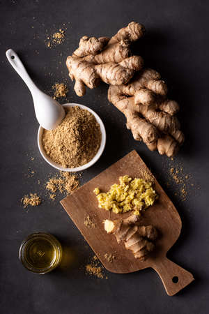 Fresh ginger roots and powder on a dark background, bright and detailed lighting