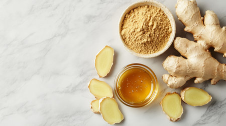 A top view of fresh ginger root and ground ginger powder alongside honey in a jar, arranged beautifully on a marble surface, perfect for culinary uses.