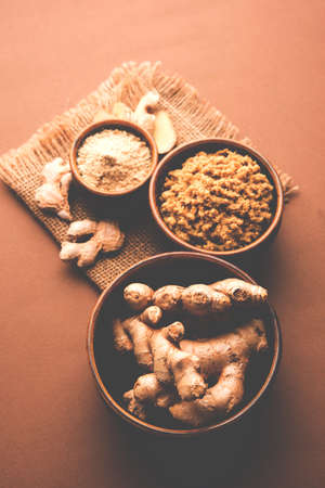 Ginger paste and powder also known as synth or sonth with whole dried and fresh ginger, selective focus