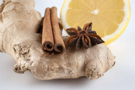 ginger, cinnamon, star anise and lemon on white background