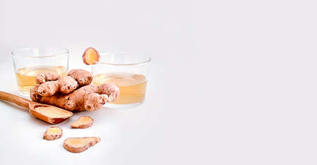 Hot ginger juice in glass and slices ginger root herbal juice tea, Ginger and lemon fresh cocktail
