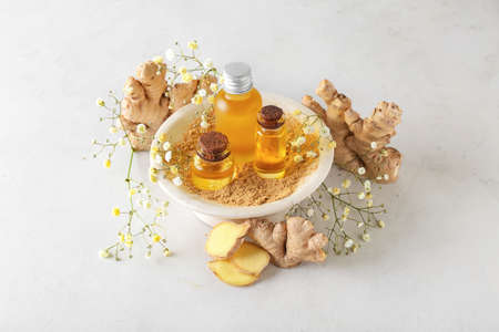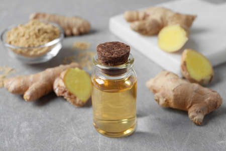 Glass bottle of essential oil and ginger root on gray table
