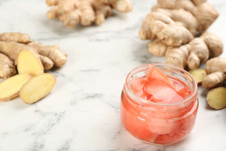 Spicy pickled ginger and root on white marble table, space for text