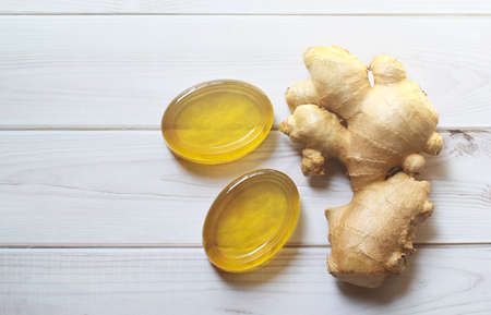 Glycerin hanmade soap., Handmade natural honey ginger soap on white wood background.