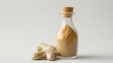 A glass jar filled with fine ginger powder next to a fresh ginger root, perfect for showcasing culinary uses, health benefits, and natural ingredients in food photography.