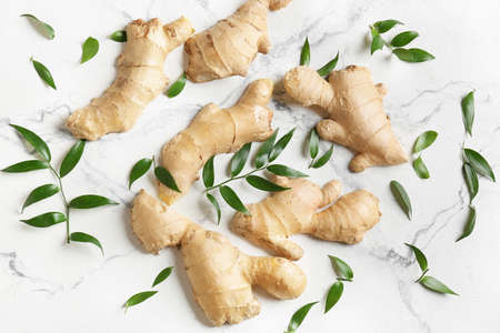 Fresh ginger and leaves on beige background