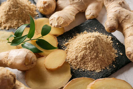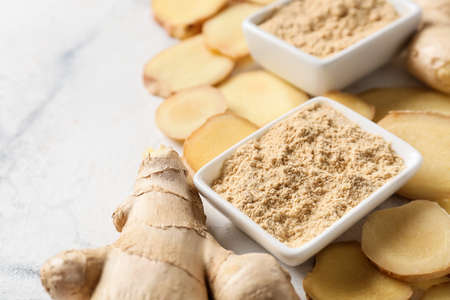Ginger powder and fresh roots on light background, closeup