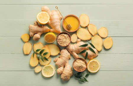 Ginger powder, honey and lemon on color wooden background