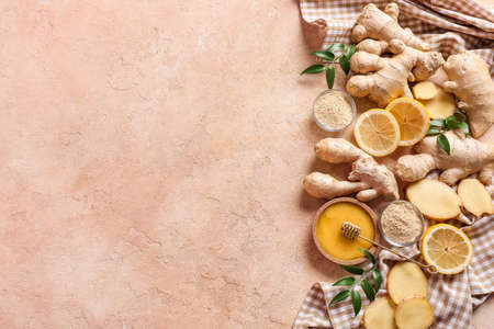 Composition with ginger, honey and lemon on color background